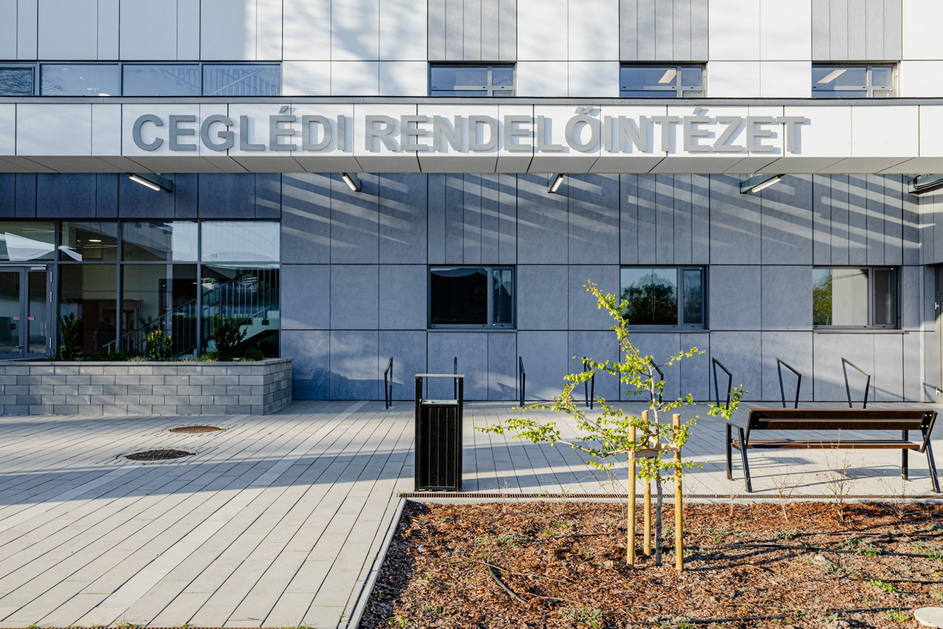 A vízgazdálkodás hangsúlyos szempont volt a területen, hiszen a lehulló csapadék nem elegendő egy ekkora, összességében körülbelül 850 négyzetméteres zöldterület fenntartására a városi környezetben, így annak rendszeres locsolása szükséges. Ehhez a területen létesített, új fúrt kút vizét szerették volna felhasználni, azonban a mintavétel és a minőségi vizsgálat után az derült ki, hogy ezt a vizet csak kezelés, illetve vezetékes vízzel keverés után lehet öntözésre használni. Víztározót is kellett tehát építeni, ahol ez a folyamat meg tud történni, és ahonnan a szivattyúk kijuttathatják az öntözővizet a zöldterületen telepített csövekbe. Természetesen az esővizet is összegyűjtik: a burkolt felületekről ez a megfelelő lejtésviszonyoknak köszönhetően a zöldterületekre jut, amelyek alatt lokálisan szikkasztósávokat helyeztek el. Ily módon a víz hosszabb idő alatt tud elszivárogni, illetve elpárologni a területről. Az automata öntözőrendszer az egyes növényeket a saját igényüknek megfelelően locsolja. A gyepfelületeket esőztető, a cserjéket csepegtető rendszerrel látták el, a fák gyökérzónájához pedig felszín alatti automata faöntöző berendezéseket telepítettek.