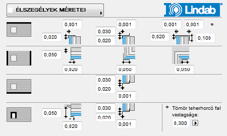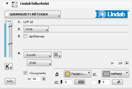 - Szerkezeti rétegek – Speciális Lindab megoldás, itt a hátszerkezet (például szelemen- vagy falvázrendszer) kialakítása is beállítható: ennek elemei is megjelennek a modellen, illetve az anyagkimutatásban is. Nemcsak a fal külső oldalának rétegei határozhatók meg ilyen módon, hanem a belsőé is.