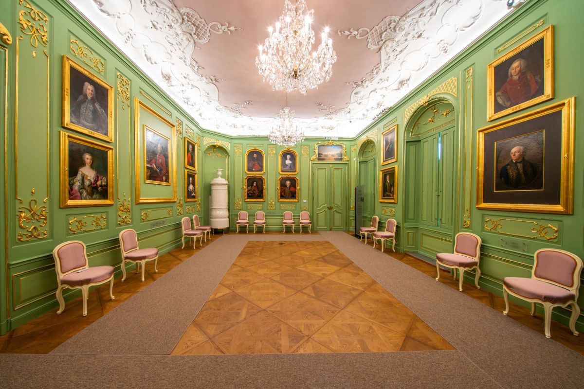A régi állapotnak megfelelő szépségében látható a díszebédlő aranyozott, festett faburkolata is