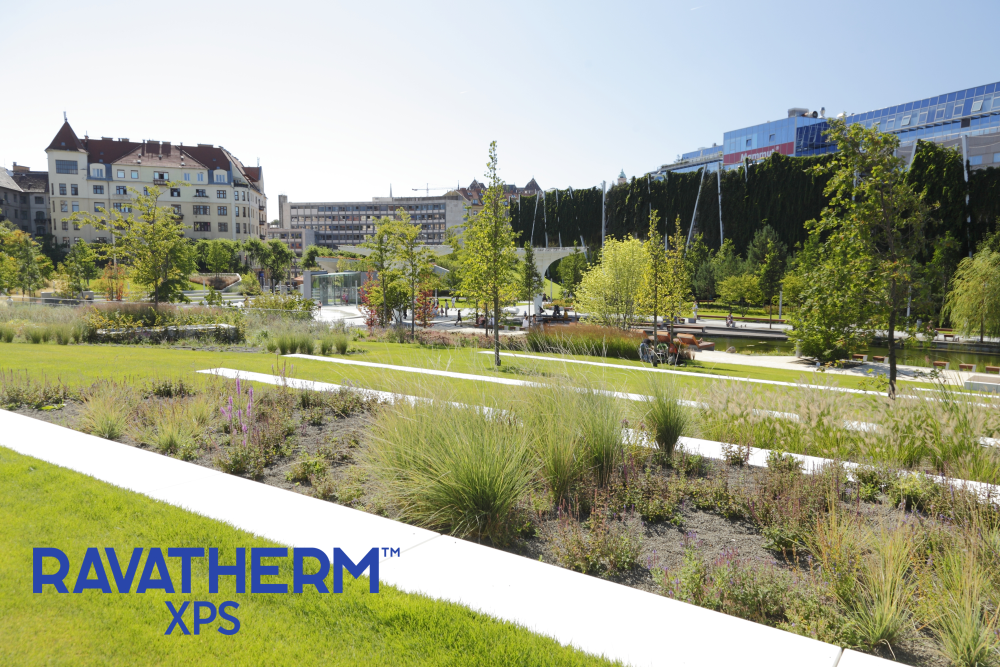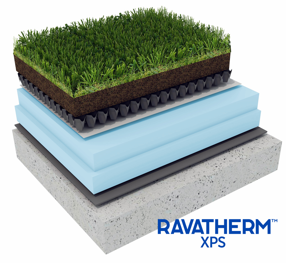 A kék színű Ravatherm XPS 300 SL hőszigetelő táblák zárt cellaszerkezetükből adódóan ellenállnak a nedvességnek, valamint a tartós terhelésnek, ezért kimondottan ideálisak fordított rétegrendű zöldtetőkhöz. Fontos megjegyezni, hogy a zöldtetők csapadékvíz elleni szigetelése gyökérálló (például FLL minősítés alapján) anyagú legyen, különben e célra szolgáló réteg beépítése szükséges. A lejtés és vízelvezetés kialakításánál fontos szempont, hogy a Ravatherm XPS lemezek ne lehessenek tartósan víz alatt. Intenzív tetőkerteknél folyamatosan vízzel árasztott drénréteg alkalmazása kerülendő.