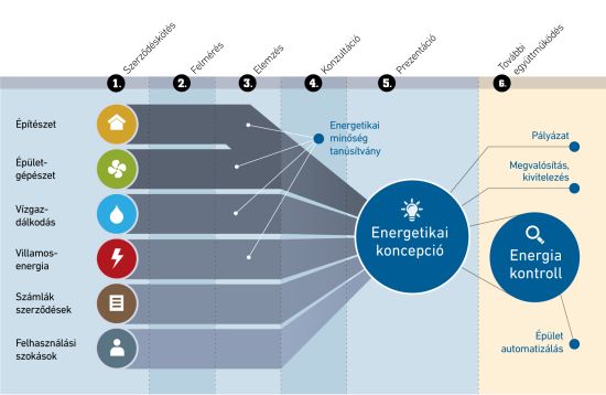 A cég döntéstámogató felmérésének eredménye az energetikai koncepció, amelyből megtudhatjuk, hogy milyen sorrendben, milyen lépéseket szükséges megtenni annak érdekében, hogy gazdaságosan és környezettudatosan üzemeltethessük az ingatlant. Az energetikai koncepció készítésének munkamódszere az alábbi ábrán látható.