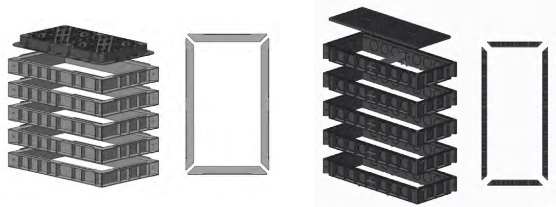 Az MCL szerelőaknák – korszerű SMC, illetve DMC rétegzett eljárással készülő – üvegszál erősítésű műanyag elemekből építhetők össze a megfelelő méretre a helyszínen. Egy-egy aknakeret magassága 150 mm, az összeszerelt akna súlya mintegy 16 kg.