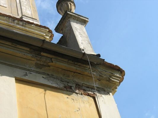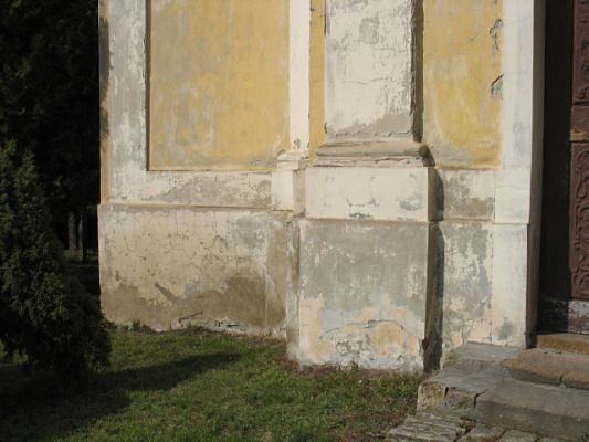 A falszigetelés hiánya, de még inkább a cementlábazat párazáró tulajdonsága és a felszíni vizek épülettől való hatékony távoltartásának hiánya jelentős kapilláris nedvesedést és ennek következtében táskásodást, vakolatmállást illetve lefagyást okozott a homlokzati felületek alsó zónájában, nagyjából a lábazat feletti 60-80 cm-es magasságig (3. kép). Szintén súlyos ázásnyomok és vakolatmállások mutatkoztak a fent említett okok miatt az eresz mentén (4. kép), illetve a torony és a torony melletti oromfal felületein.