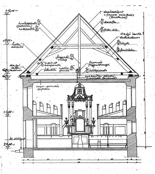 - a megnövekvő héjazati terhelés miatt a barokk keretállások keresztmetszeti megerősítése is szükséges volt, amelyet a feszítődúc és a hozzá símuló szarufa, illetve a mellszorító és a rajta lévő torokgerenda megfelelő sűrűségű összecsavarozásával, s ezáltal együttdolgozóvá tételével értünk el (ahol a feszítődúc és a szarufa között eredetileg rés volt, ott az együttdolgozást keményfa betétekkel is növeltük);