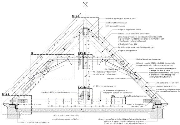 Az apszis fölött az említett szétcsúszási jelenségek megállítására acélszerkezetű csomóponti megerősítéseket terveztünk a kontycsúcs alatti főállás és a „csonka" főállások mellszorítói között, másrészt a kötőgerendák szintjén is. Ugyanitt a hiányzó fiókváltókat is pótoltuk.