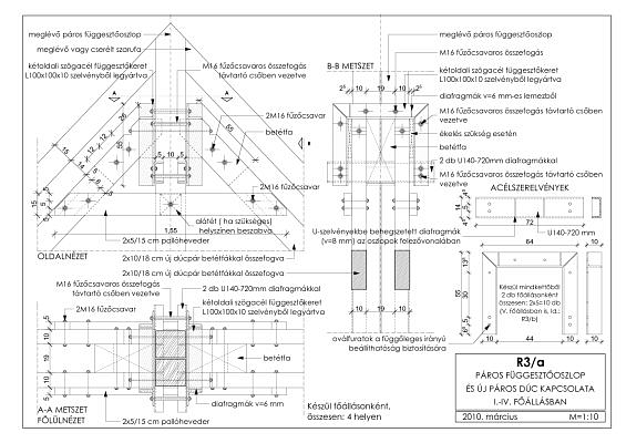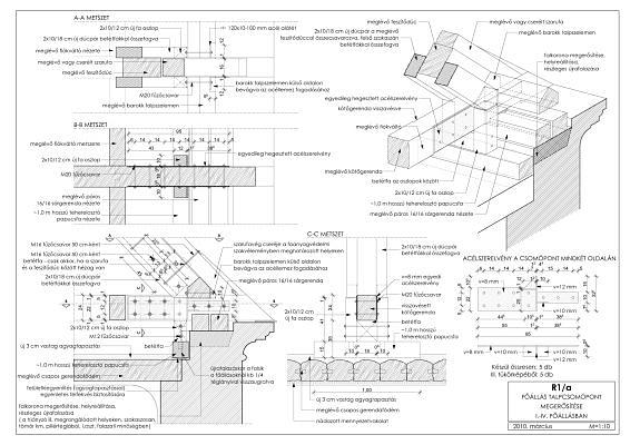 - az ezen dúcpárokkal működőképessé váló függesztőmű csomópontjainak megerősítése egyedi acél csomóponti szerelvényekkel és fűzőcsavarokkal történt (III.-IV. ábra, 6.-7.kép);
