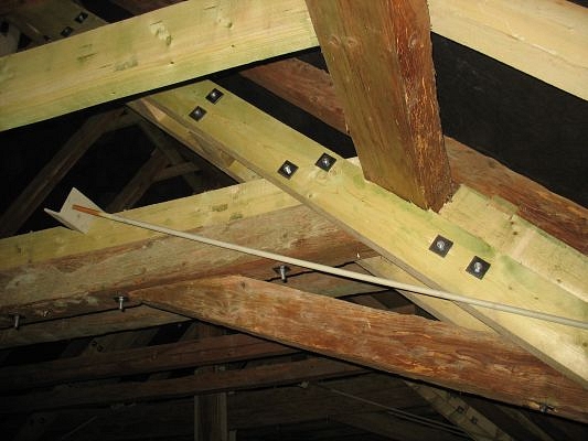 - 2 x 10/18 cm keresztmetszetű kettős ferde dúcpárt építettünk be a függesztőmű dúcaiként, a feszítődúcok két oldalán elhelyezve és azokhoz hozzácsavarozva, a mellszorító síkja fölött is a tetősíkkal párhuzamosan továbbvezetve, és kb. 50 cm-enként betétfás-fűzőcsavaros kapcsolattal összefogva;