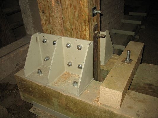 - a páros függesztőoszlop és a mellszorító kapcsolatánál a korábbi, az erőjátékot zavarossá tevő kapcsolatot megszüntettük: a meglévő, összekötő csavarokat – ahol volt ilyen – eltávolítottuk, a mellszorítónak a páros oszlopon való átvezetésénél az oszlopokban lévő kivágást pedig megnagyobbítottuk annak érdekében, hogy a függesztőmű és a barokk keret külön, tiszta erőjátékkal működhessen, és a páros oszlop véletlenül se terhelhessen rá a mellszorítóra; az oszlopokat pedig e keresztmetszetcsökkenéssel járó átvezetés helyén a biztonság kedvéért acélszerkezetű megerősítéssel láttuk el;