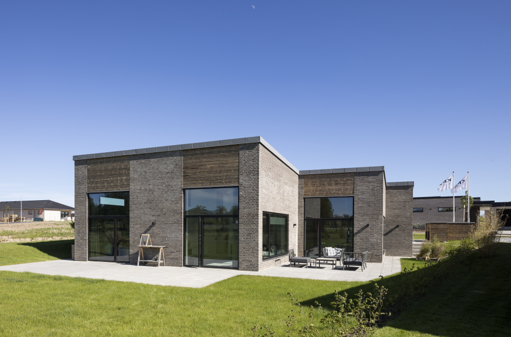 A kis dániai falu szélén található lejtős telek adottságaihoz igazodó, tájba simuló lapostetős épület téglahomlokzatával, sötét keretű ablakaival és ajtóival a nyugodt skandináv modernizmus igazi letéteményese. Tömegalakítása is egyszerű, kompakt, az utca felőli homlokzatot síkjából kissé visszaugratott rész teszi érdekesebbé, mely védelmet nyújt a bejáratnak, garázskapunak, és egyúttal keretbe is foglalja azokat.