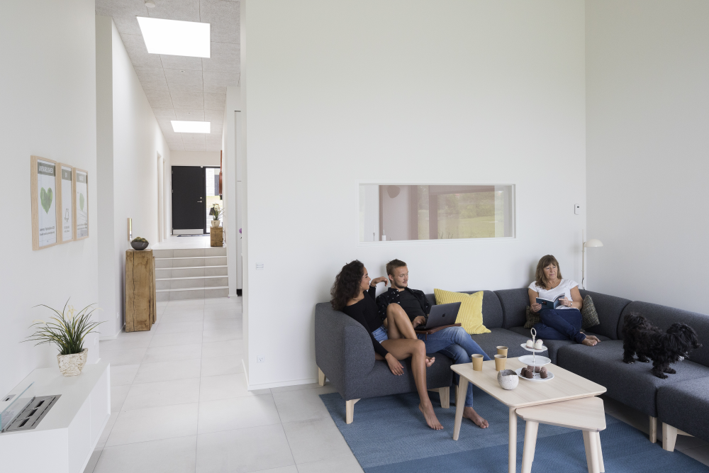 A ház tervezése során kiemelt szempont volt a fenntarthatóság: a tetőn elhelyezett napelemek és a megfelelő hőszigetelés kialakítása is hozzájárult ahhoz, hogy az épület megkapja az aktívház minősítést, a napfény szerepének erősítésével pedig minimalizálták a fenntartási költségeket. Ehhez olyan, kiváló minőségű nyílászárókra volt szükség, amelyek hőátbocsátási és fényáteresztő képessége is kiemelkedő. A KFS-Boligbyg Építésziroda a VELUX tetőtéri ablakok mellett döntött, mert, mint mondták, ezek széles válastéka és a skandináv dizájnhoz való illeszkedése segítette leginkább a kettős cél elérését: a napfény szerepének hangsúlyozását, valamint az energiafelhasználás optimalizálását.