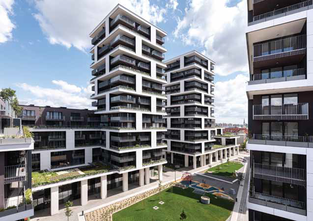 Nem kevesebb, mint 632 lakás van az együttesben (és 740 parkolóhely), egy új utcáról, az egykori bőrgyárosról elnevezett Wolfner utcáról tárul fel a parkolószint, és új, Váci úti csomópontot is létrehoztak. Így is kerültek még a földszintre gépkocsitárolók. A földszinten kis éttermek, kávézó, az első emeleten irodák vannak, de itt még egy-egy közösségi terem is helyet kapott, ahol zsúrokat, összejöveteleket lehet tartani. A felső szinteken a középfolyosók 10-12 négyzetméteres átriumokat is kaptak kúszónövénnyel, így lettek fénnyel átjártak, barátságosak. Itt a zöld nem csak a látványtervekre korlátozódik. A homlokzatokon a széles – 2,30-as – teraszokhoz virágvályúk csatlakoznak minden második szinten, egy-egy – összesen kétszázhúsz – előnevelt négyméteres fával, kúszónövényekkel. Az összesen 3600 méter hosszban elhelyezett vályúk hőszigeteltek (hogy télen a gyökerek ne fagyjanak el), és csepegtető öntözéssel ellátottak. Közöttük függőleges futtatófalak teremtenek összeköttetést, kialakítva a jellegzetes rajzolatot, ami optikai trükkel csökkenti az épület méretét. Ráadásul ezek mögött a sávok mögött a tárolódobozokban a teraszbútorok is elhelyezhetők, valamint a légkondicionálók külső egységei. A növényeket nem bízták a lakókra: a már említett „alpinista kertészek” gondozzák, és az említett öntözőrendszer látja el őket vízzel és tápanyaggal.