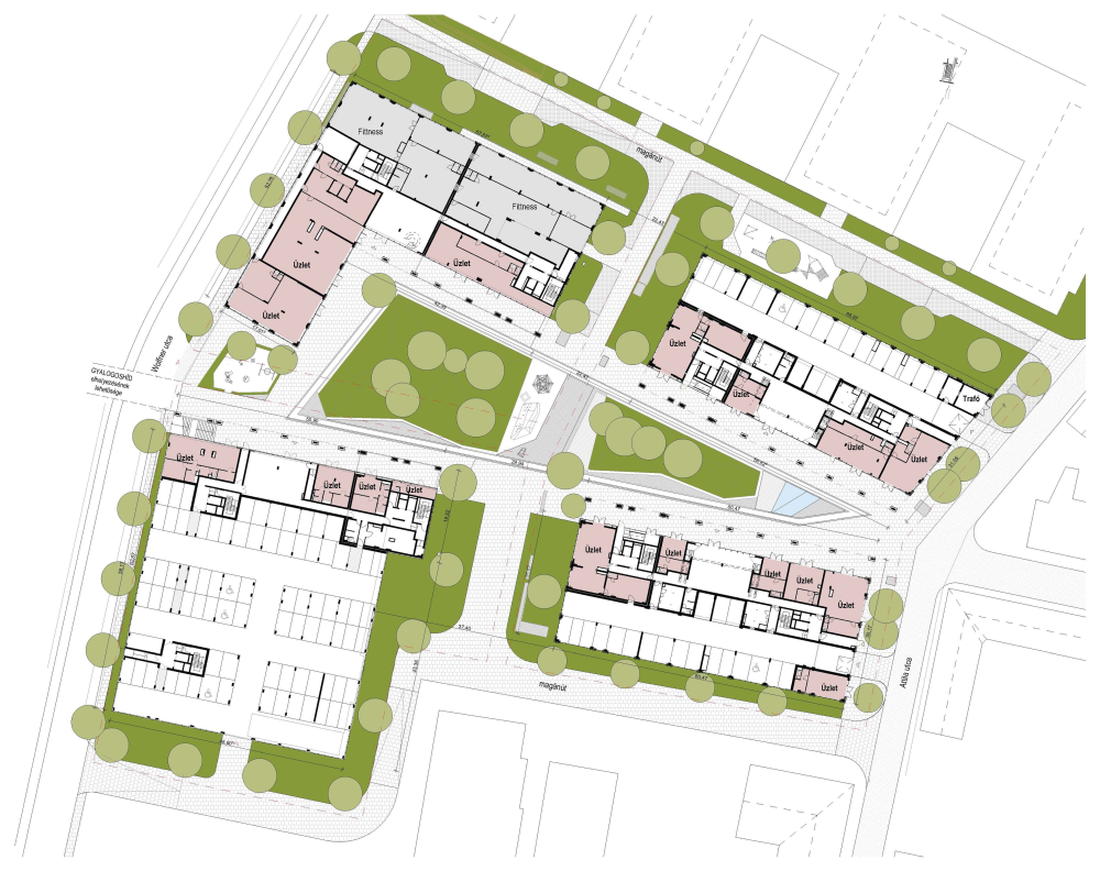 Itt szinte bármit lehetett volna építeni, de Hajnalék igazodtak a városi környezethez, és keretesen építették be a területet, négy elemre bontva az épületegyüttest. Két épület a Károlyi István utca, míg a másik kettő a József Attila utca koordinátarendszeréhez igazodik, ezáltal természetes módon alakul ki az épületek közötti trapéz alakú városi tér, melyhez kétszintes árkádsorral csatlakoznak az épületek. Ez az átmeneti tér kávézókkal, éttermekkel teremti meg kora tavasztól késő őszig a városi élet színterét. Belülre került a négy darab 18 szintes torony, itt voltak elhelyezhetőek a szabályozás szerint. Ennek az elhelyezésnek köszönhetően a tornyok nem nyomasztóak, az ember a központi téren csak a környező kétemeletes házak magasságát érzékeli igazán, és azokat is lazítják a cour d’honneurök.