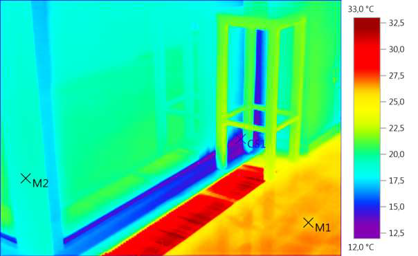 Ugyancsak elkészültek a Testo 885-2 hőkamerával készült mérések és felvételek. Ezekről egyértelműen kiderülnek a DK-i fal hőtechnikai problémái, ami ezek miatt nagy lehűlő felületet képez. Az adatokról az is leolvasható, hogy a fémszerkezetű, homlokzati Schüco nyílászárók beépítésénél a tok és a fal közötti hőszigetelő tömítés nem megfelelő, ezért ott is lehűlő felület keletkezett. Bizonyos fűtőtestek nem működnek, ezek is lehűlő felületeket képeztek. Mindezek jól láthatóak a hőkamera-felvételeken.