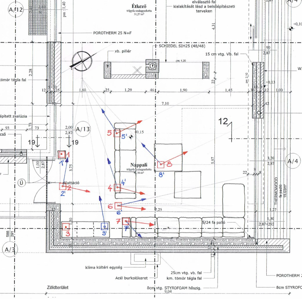 Földszinti alaprajz az ellenőrző mérések piros színű jelölésével