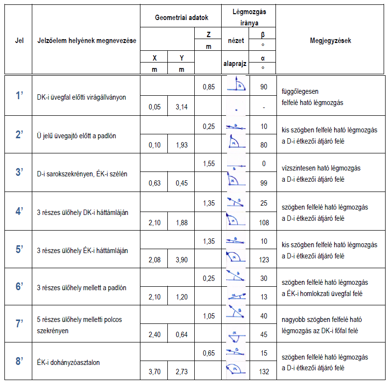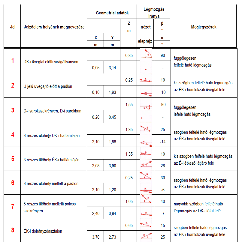 Megvizsgáltuk az építtető által előadott jelenségeket, melyeket az alaprajzon is ábrázoltunk az észlelt légáramlatok jelölésével. Pirossal jelöltük a légmozgás irányát nyitott kétszárnyú üvegajtó esetén, és kékkel zárt üvegajtó esetén. Az X, Y, Z a vizsgálati hely térbeli koordinátáit jelöli, az α a helyiség DK-i főfalával párhuzamos egyeneshez képest mért szög, β pedig a helyiség padlójával párhuzamos egyeneshez képest mért szög értéke.