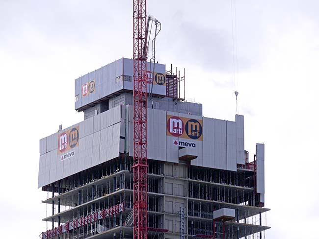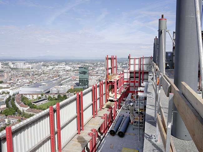 A kivitelezést a kifejezetten csendesen és szinte észrevétlenül haladó MEVA MAC automatikus önkúszó zsalujával végezték, amely nagy magasságokban is teljes biztonságot nyújt. A MEVA mérnökei számára az épület felfelé keskenyedő kúpos geometriája igazi kihívást jelentett.