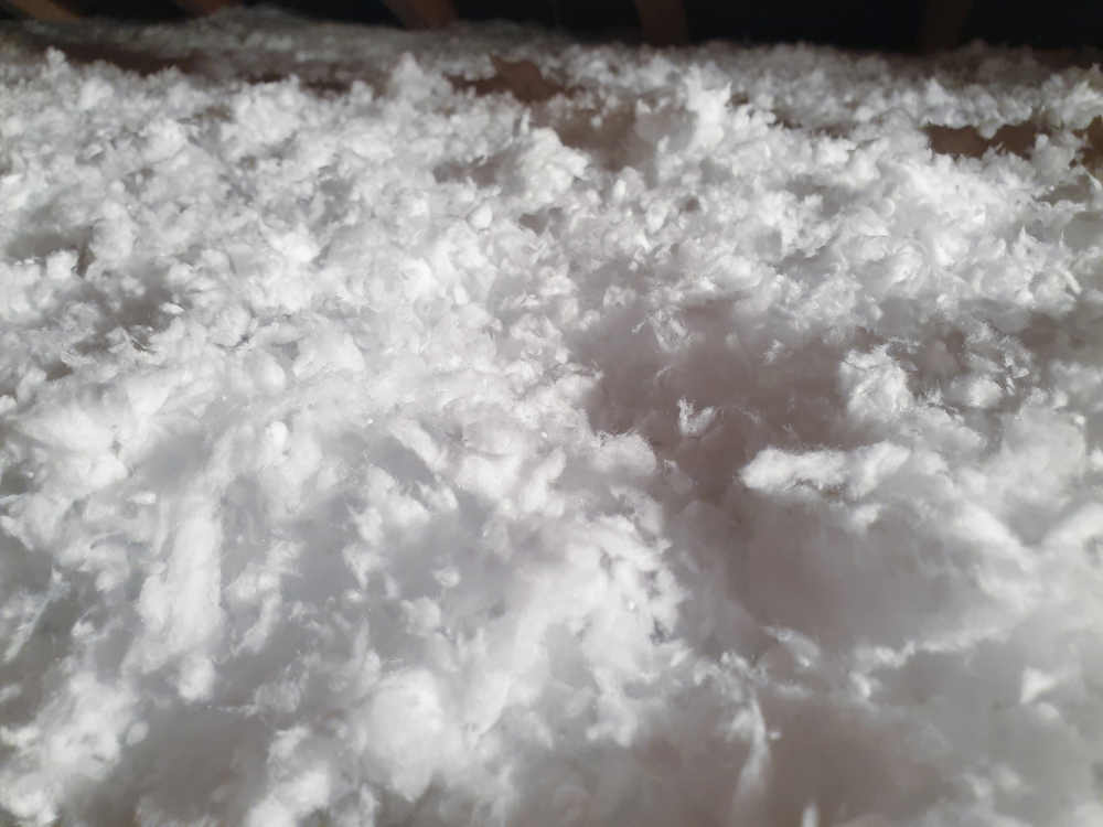 Ezt követte – a meglévő régi hőszigetelés megigazítása után – a befújt üveggyapot hőszigetelés elkészítése a szarufák között és a koszorúknál, Supafil Cavity termékkel, 35 kg/m3 testsűrűséggel. „Ezzel az anyaggal azért dolgozunk, mert beépítésével nagy energiamegtakarítás, kisebb fűtési költség érhető el. Jó befektetés, mert tartós termék, az épület teljes élettartama során állandó teljesítőképességet nyújt. Ár-érték arányban kihozzuk a maximumot vele a meglévő szerkezetből. Optimálisan eloszlik az üregekben, így minden hőhíd megszüntethető. A Supafil kellemes hőkomfortot teremt, a belső falfelület nem érezhető hidegnek, a helyiségekben homogén hőmérsékleteloszlás van. A termék nem csak termikus, hanem akusztikai kényelmet is nyújt. Környezetbarát, csökkenti a CO2-kibocsátást, kötőanyag- és vegyszermentes termék, amely az A1 európai tűzvédelmi osztályba tartozik. A fújható Supafil hőszigetelő anyagoknak köszönhetően az épületek megjelenése változatlan marad.”