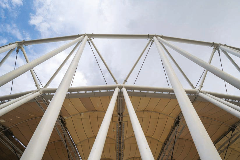 A 840 méter kerületű acélszerkezetet 48 darab egységből szerelték össze, ami összesen 384 darab szerkezeti elem precíziós gyártását igényelte. Erre a szerkezetre gyártottak és szereltek 268 darab különböző átmérőjű és különböző hosszúságú kábelt. A kivitelezési munkákat követően mind az acélszerkezet, mind a kábeltető a tervezett alakra állt be pár milliméteres eltéréssel – ez az érték egy ekkora épület tervezése esetén egyedülálló teljesítmény.