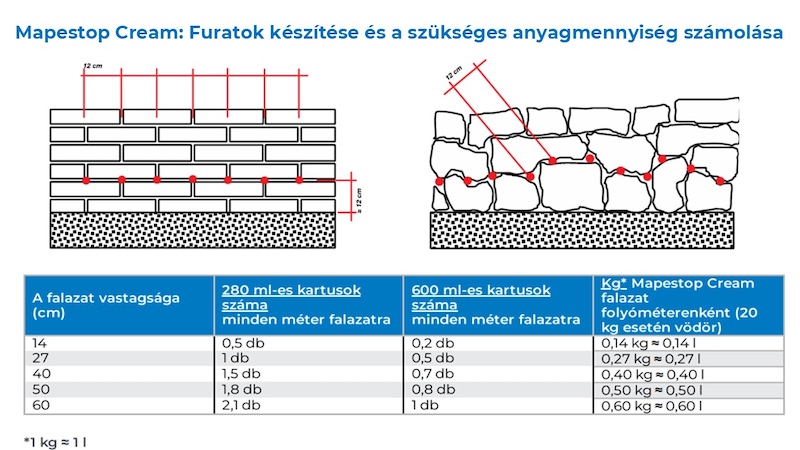 Téglából, falazóblokkokból vagy egyenletes formájú kövekből készült falazat esetén a vízszintes furatokat a habarcsrétegbe készítsük. Egyenetlen formájú kövekből készült falazat esetén fúrjuk a lyukakat a habarcs vonalát követve, a lehetőség szerinti legegyenesebb vonalban. Ha a szerkezet rendkívül porózus, a furatok készülhetnek közvetlenül az építőelemekbe is. A krém injektálása előtt tisztítsuk ki a furatokat, távolítsuk el a port és a laza anyagokat, és a kiegészítő segítségével, a furatok teljes kitöltésével már injektálható is a krém a falazatba. A szükséges Mapestop Cream mennyisége az ábrán látható táblázat segítségével számítható.