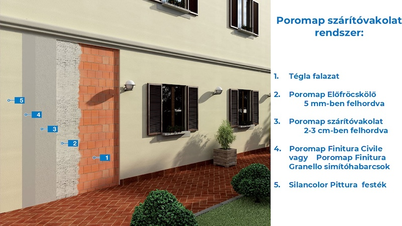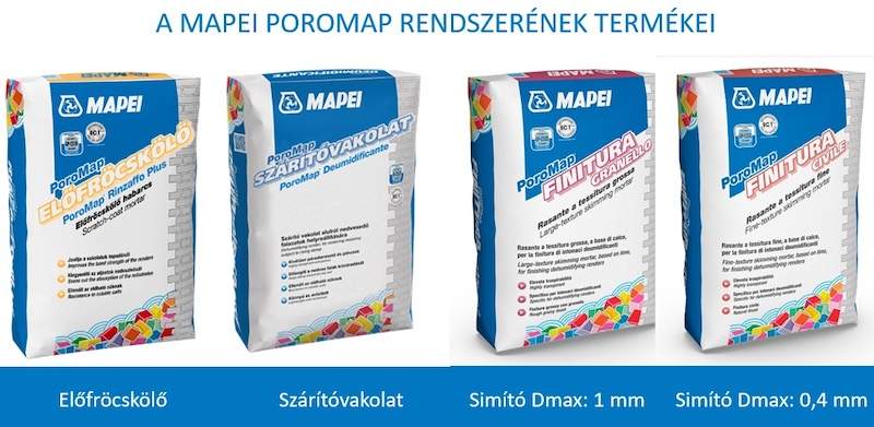 A régi vakolat eltávolítása után a nyers falazatot először tisztítsuk meg vízzel a sókivirágzástól, a felületén jelen lévő sóktól. Ezután a Poromap Előfröcskölő (gúzoló) anyag kerül fel közvetlenül a megtisztított falazatra kb. 5 mm vastagságban. Az előfröcskölő réteg alkalmazásának célja, hogy megfelelően homogén felületet képződjön a szárítóvakolat számára, növelje a tapadást, illetve, hogy megakadályozza a falazatban lévő sók túl korai vándorlását a szárítóvakolat megkötése előtt. A Poromap Szárítóvakolat egy speciális sóálló és makropórusos vakolat, amely jó páraáteresztő képessége révén megkönnyíti a falazatban lévő nedvesség természetes kipárolgását, miközben makropórusaiban képes tárolni a falazatban található sókat és így a régi falazat helyett esztétikus, jól működő száraz felületet képez. A Poromap Finitura simítóhabarcsok finomszemcséjű, a szárítóvakolathoz hasonlóan szintén sóálló, páraáteresztő és mészbázisú természetes felületképző anyagok, melyek segítségével tudjuk kialakítani a felújított falszerkezet kívánt esztétikus felületét.