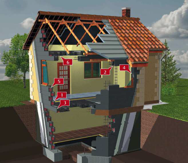 1. Falelem 2. Áthidalóelem 3. Koszorúelem 4. Végzáróelem 5. Magasítóelem 6. Födémelem