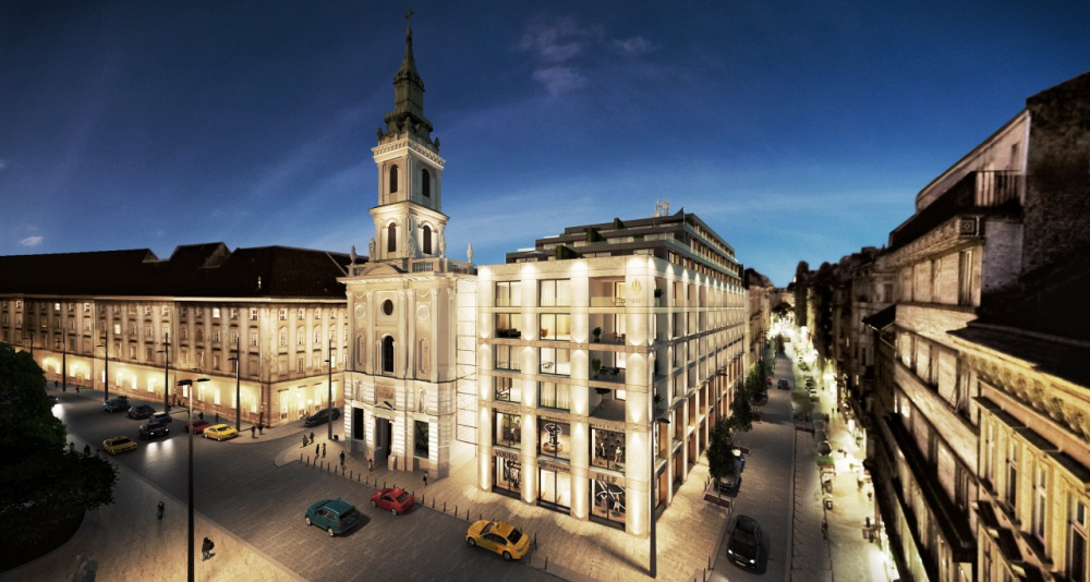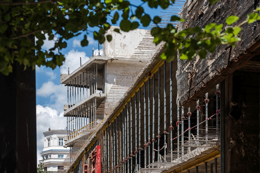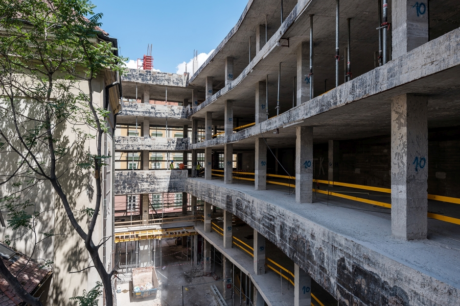 Az épület nagy részét – ahol a lakások kaptak helyet – az átalakítás során egészen a második emeletig kellett visszabontani, majd erre épült vissza hat új szint, monolit vasbetonból. Az összesen nyolc szintes épület három legfelső szintjén felfelé egyre csökkenő alapterületű tetőteraszok találhatók a Szervita tér felől. A Petőfi Sándor utcai homlokzat 2,5 méter mélységű sávját a földszintig kellett bontani, majd az új pillérek és födémek zsaluzását, betonozását követően újjáépíteni. Ennél a szárnynál a 4,75 méter magas szerkezetek zsaluzására a MEVA MAMMUT rendszer gyors és daruzható, nagy teherbírású, fal-, illetve pillérzsaluzatait használták. Az okos kombi átkötési hellyel a MAMMUT XT alkalmazásakor egy kézmozdulattal három átkötési mód között választhattak. Minden elem szimpla- és kontraoldali zsaluként is bevethető átszerelés nélkül, ezzel jelentős időráfordítás takarítható meg, és leegyszerűsíti a logisztikát is.