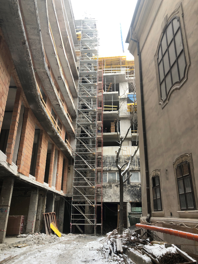 A Városház utcai, illetve a belső udvarra néző szárnyat, amely hotelként fog üzemelni, a negyedik emeletig kellett visszabontani, de a liftakna megépítése érdekében egy bizonyos födémszakaszt egészen a földszinttől kellett újraépíteni. A födém alatti megerősítő, függőleges szerkezetek zsaluzásához az AluStar rendszer kézi mozgatású és 60 kN/m2 teherbírású falzsalurendszert használták. Az AluStar rendszer legnagyobb, 270/90 méretű eleme is csak 65 kg, így könnyen és gyorsan mozgatható, amely hatékony munkát biztosít. Az AluStar súly és teljesítmény szempontjából a legjobb falzsalu. Tökéletesen kiegészíti a nagytáblás StarTec zsalut olyan helyeken, ahol darut nem lehet használni, így például egy 5. kerületi szűk utcában is.