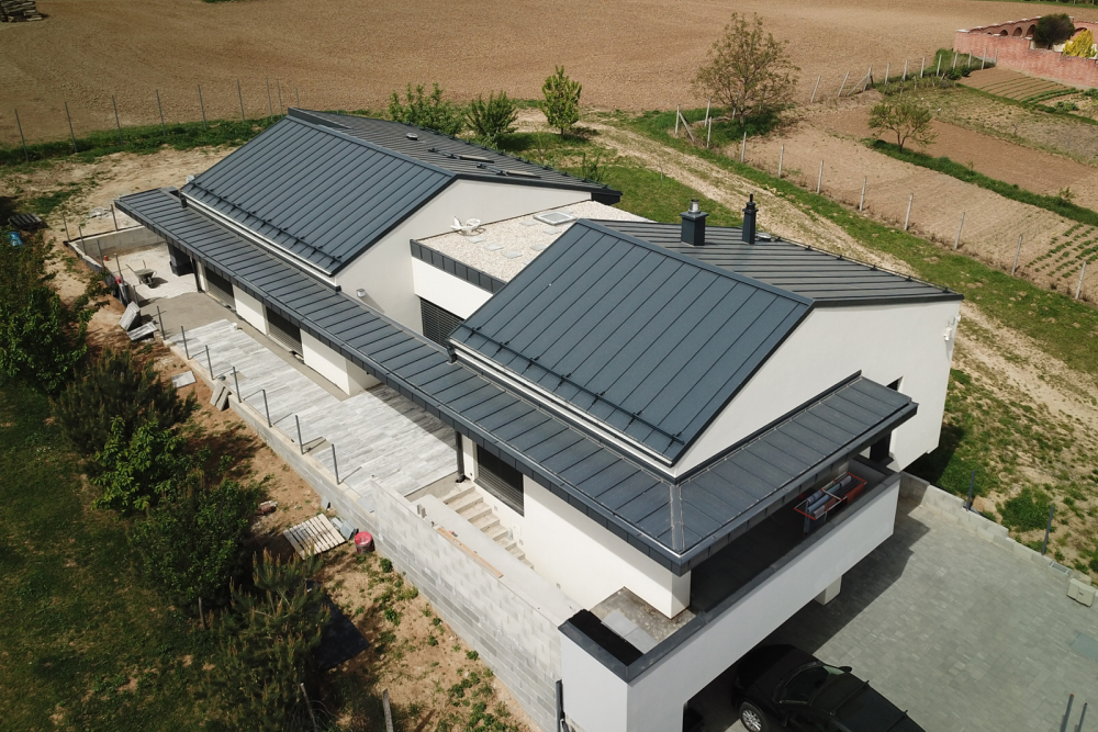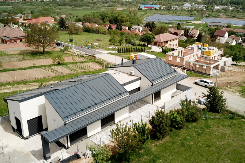 - A lemez jellegéből fakadóan nagyszerű, egyenletes síkok alakíthatóak ki. És kiváló hatás érhető el a kiemelkedő, párhuzamosan futó korcokkal, amelyek egyfajta hullámzást, ritmust adnak a látványnak. És ezek a korcok nem csak a gerincre függőlegesen haladhatnak, mert megoldható, hogy akár hatvan fokos szögben ereszkedjenek alá. A tervező számára tehát a lemezcsatlakozások geometriája sokféle variációs lehetőséget biztosít, ez a termék nem köti gúzsba a fantáziát. Nem is beszélve a színkombinációkról. A homlokzat, az ereszcsatorna és a síklemez árnyalatai ugyanis harmonizálhatnak, vagy épp ellenkezőleg: a kontrasztosság adhat dinamikát az épület megjelenésének. Azt hiszem, a síklemez alkalmazása szemléletformáló esztétikai üzenetek lehetőségét is tartogatja. A családi házak építtetőit ugyanis a kényelem, a praktikum és a tartósság mellett elsősorban az épület külleme, tetszetőssége motiválja. Ha pedig lát egy-egy meggyőző, megvalósult példát – jól mutatja ezt Szabolcs esete is –, akkor hajlandó lesz szakítani a „piros cserép, fehér fal, fekete lábazat” mélyen gyökerező sztereotípiájával.