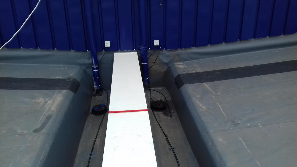 A járóútvonal mintás felületű, csúszásmentesített, fekete színű, járósávok céljára készült TPO lemezből készült, 50 cm szélességben, a csapadékvíz elleni szigeteléshez forrólevegős hegesztéssel rögzítve.