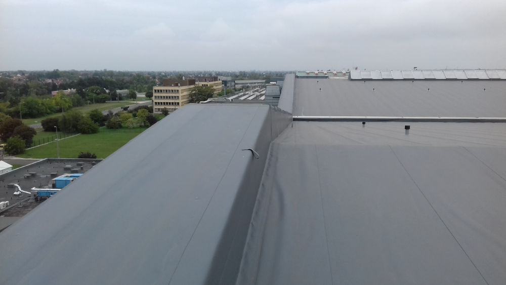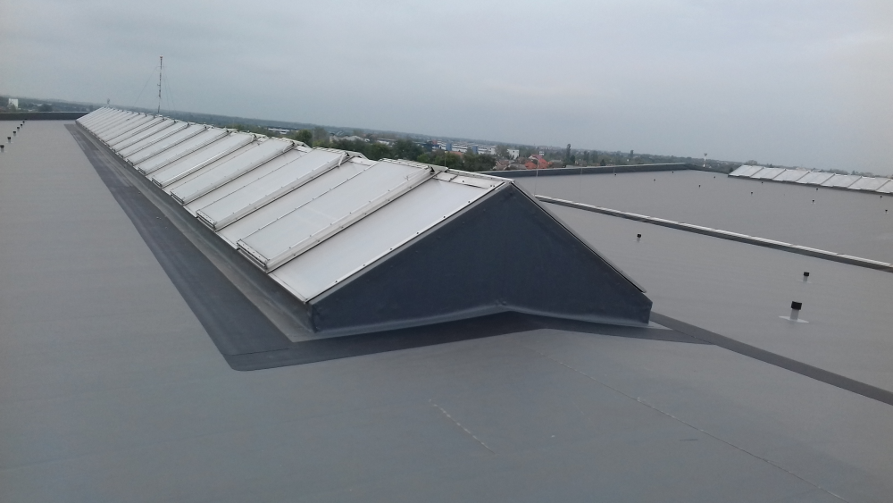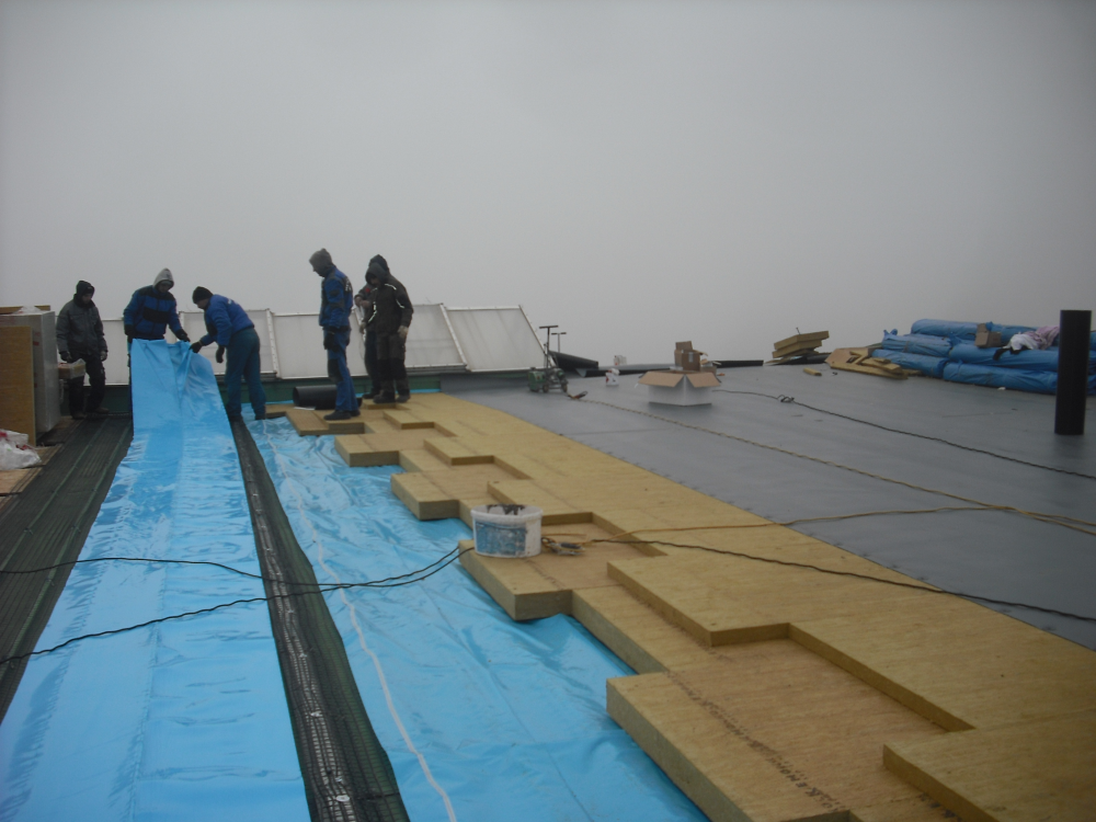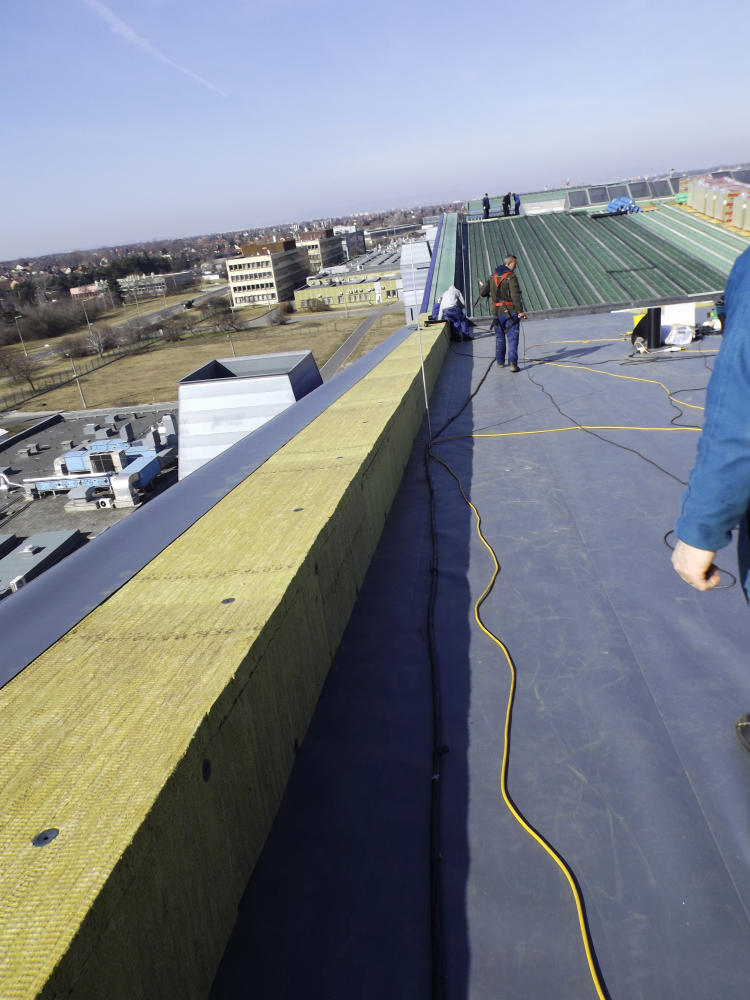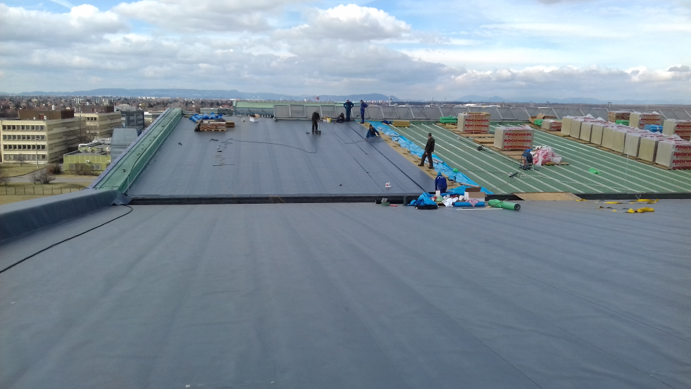 Az új csapadékvíz-szigetelés anyaga RAL 7012 színű, középszürke TPO lemez, a tetőfelületen 1,5 mm vastag, 105 cm szélességű lemez, 15 cm átfedéssel fektetve, az átfedések alatt az Ω-profilokhoz teleszkóp rendszerű mechanikai rögzítéssel, fektetési iránya a trapézlemez bordáival párhuzamos. Az így kialakított rendszer lecsúszás ellen is megfelelő. A tetőszigetelés helyes páratechnikai működése érdekében a csapadékvíz elleni szigetelésbe kellő számú tetőszellőzőt építtetünk be.