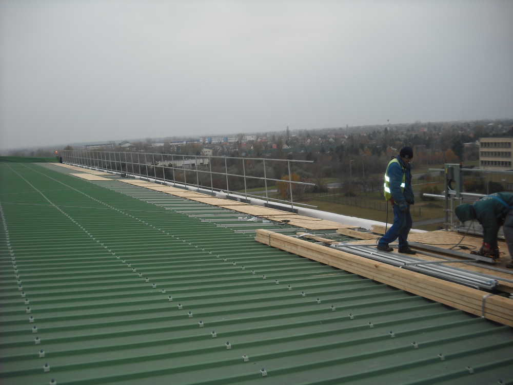 A tetőn az első feladat a leesés elleni védelem biztosítása volt, a keleti és a nyugati oldalon, tehát a korlátra mielőbb szükségünk volt – de már ennek megépítéséhez is gondoskodnunk kellett leesés elleni védelemről. A szilárdan rögzített járórácshoz és a déli attika és a nyugati fal acélszerkezetéhez a tető szélétől körülbelül 2,5 m-re drótkötélpályát telepítettünk, melybe a tető szélén dolgozók testhevederjüket beakasztották. Az alsó sor erősítő Ω-profilt elhelyeztük, majd erre ideiglenesen 15 mm vastag OSB-3 lemezt rögzítettünk szállítási, anyagtárolási és szerelési aljzatnak.