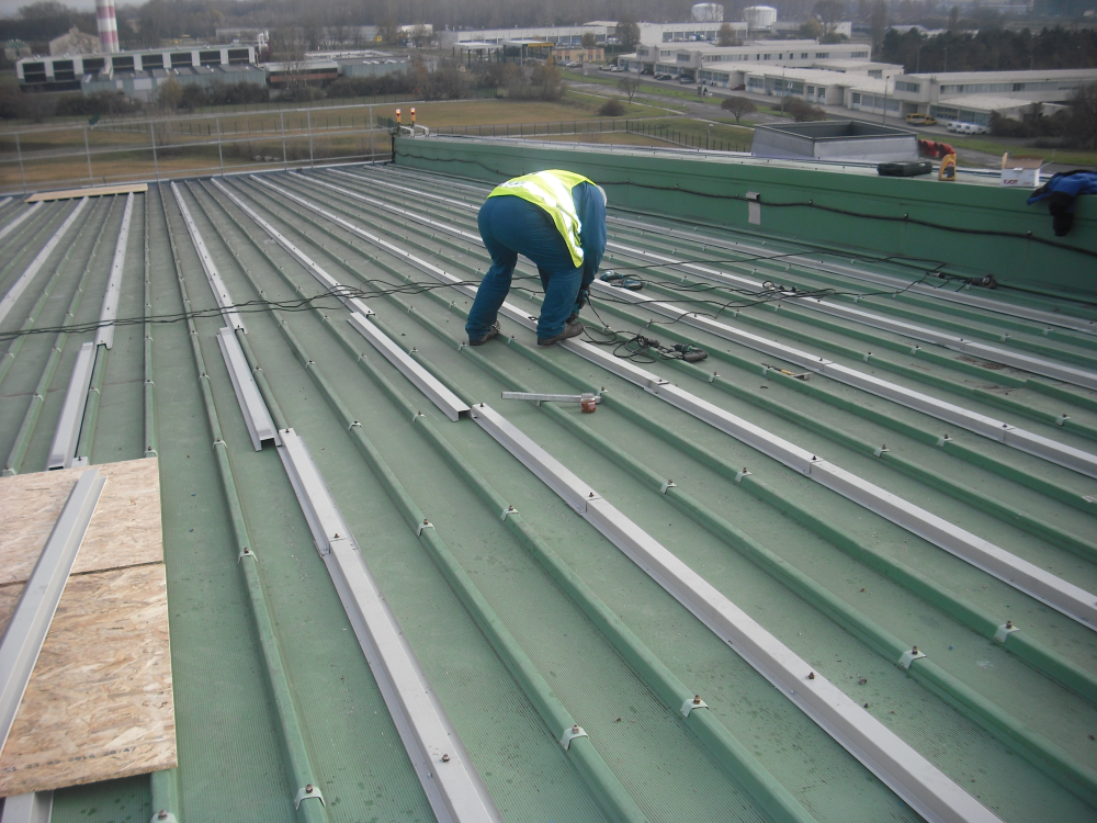Mivel a 0,8 mm lemezvastagú alumínium trapézlemez nem terhelhető, és az új szigetelési rendszer mechanikai rögzítésére sem alkalmas, a tetőhéjalás megerősítésére volt szükség. A statikai szakvélemény megállapította, hogy a távtartók terhelhetősége bőségesen elegendő. Az erősítést méretezés alapján minden harmadik bordán, azaz 90 cm-enként (a megrogyott alu trapézlemezeknél és a felfogócsúcsoknál bordánként, azaz 30 cm-enként) 1,0, illetve 1,25 mm vastag bevonatos acéllemez profillal alakítottuk ki, a távtartókhoz rögzítve. A rögzítésre rozsdamentes Ejot JF3-2-5,5×25 csavarokat használtunk.