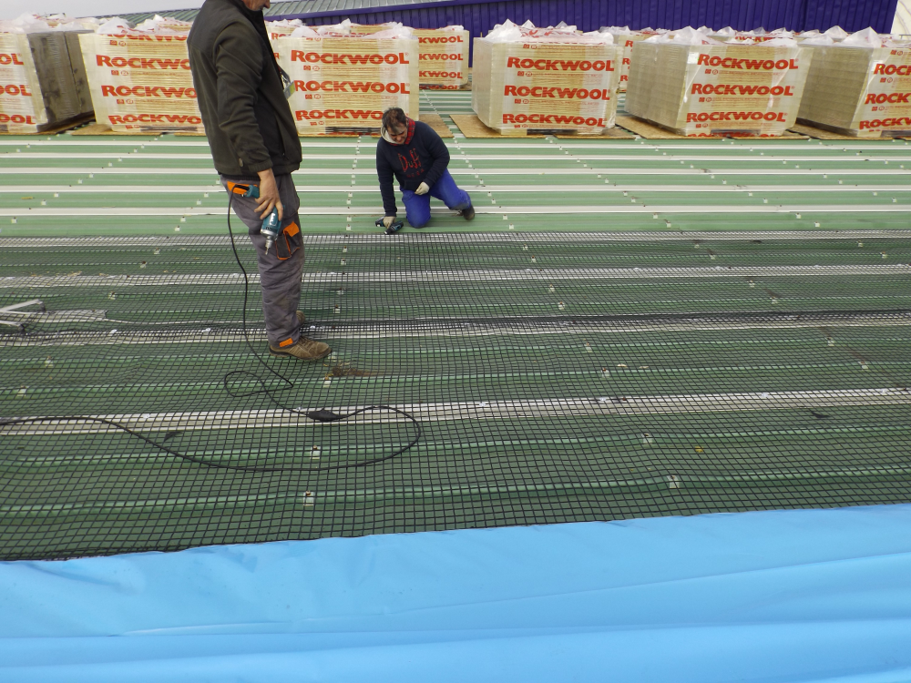 A tetőrétegrend súlyát az alumínium trapézlemez helyett tehát az Ω-profilokra kívántuk terhelni, ennek érdekében kereszt- és hosszirányban egyaránt 50 kN/m szakítószilárdságú (általában az útépítésben használatos) üveghálót feszítettünk ki, majd erre PE párafékező fólia került, kétoldalas öntapadó szalagokkal felületfolytonosítva.