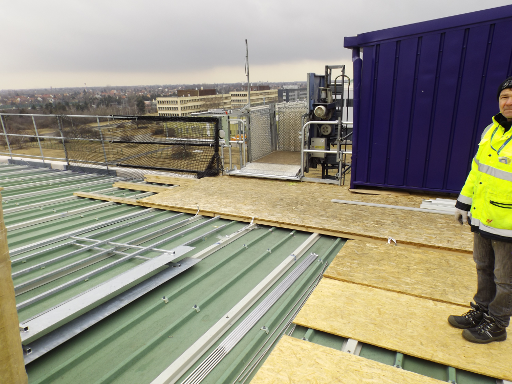 Az épület körül bőségesen volt hely az érkező szigetelőanyag elhelyezésére. Ugyanakkor a tetőn a gyenge trapézlemezre nem daruzhattunk, és az is cél volt, hogy a tetőn a lehető legkevesebb anyagmozgatásra legyen szükség. Ezért az Ω-profilokat a tetőn előzetesen felszereltük, majd erre – előre megtervezett helyekre – a főtartók fölé ideiglenesen 15 mm vastag OSB-3 lemezt rögzítettünk. A járórács felszedését követően a tető lépcsőháztól kiindulva a tető keleti végéig az OSB lemezből járóútvonalat is kialakítottunk.