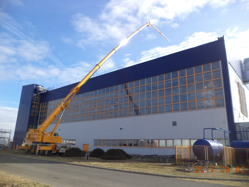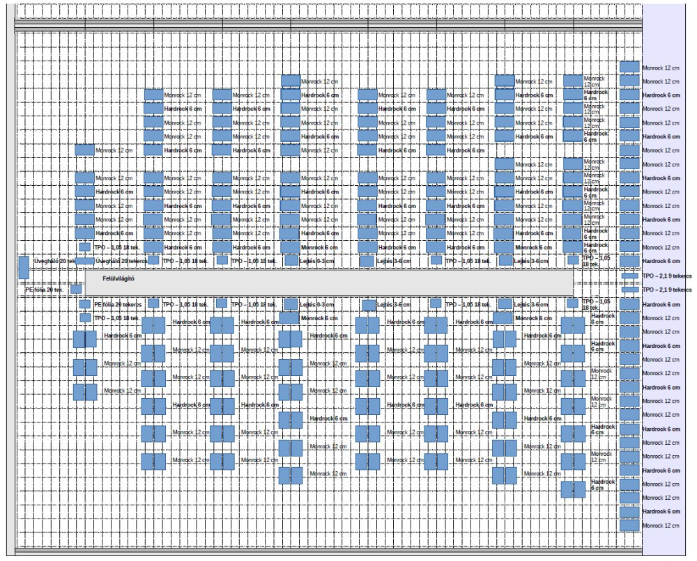 A hő- és vízszigetelő anyagokat – mint az a tető terhelhetőségének figyelembevételével is kialakított elhelyezési vázlaton is látható – a sáv-felülvilágítón is át akartuk emelni. Ehhez olyan mobildarut választottunk, mely kiszerelt, 40°-ban betört segédgémmel, 54 m vízszintes kinyúlásnál még 7 kN teherbírású. A darut úgy állítottuk be, hogy királytengelye az épülettől 14 m-re legyen. A sáv-felülvilágítón átemelt kőzetgyapot bálákat a sima OSB lemezen kézi erővel le tudtuk húzni a tervezett helyére.