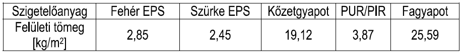 A téglafal hőszigetelés utáni tervezett hőátbocsátási tényezője 0,2 W/m2K, ami ezúttal is a jelenlegi hazai minimum követelmény (0,24 W/m2K) és a javasolt érték (0,12 W/m2K) közé esik. A hőszigetelő lemezek rögzítésénél mindegyik anyagnál ragasztással és kiegészítő dübelezéssel is számoltak. A funkcionális egységre eső felületi tömeg a szürke EPS 2,5 kg/m2-es értékétől a fagyapot 25,6 kg/m2-éig terjedt.
