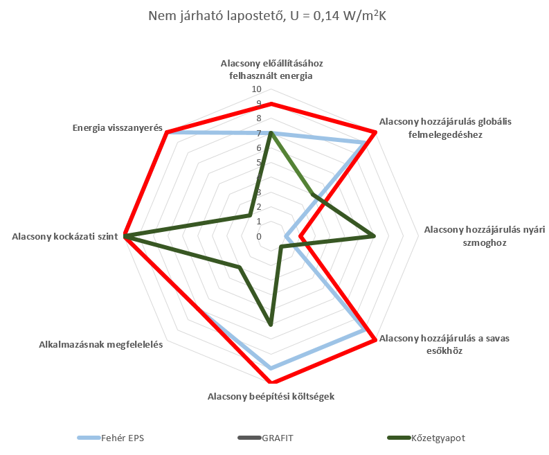 A vizsgált nem járható lapostető hőátbocsátási tényezőjét 0,14 W/m2K-ben határozták meg, ami a jelenlegi hazai követelménynél (közel zéró energiafelhasználási modell, 0,17 W/m2K) alacsonyabb, de a javasolt értéknél (0,12 W/m2K) megengedőbb. A szigetelőréteg vastagsága 15 cm-től (PUR/PIR) 26 cm-ig (kőzetgyapot), a felületi tömeg 4,4 kg/m2-től (grafit EPS) 41,2 kg/m2-ig (kőzetgyapot) terjedt.