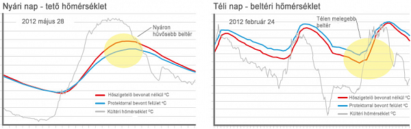 - a belső hőmérsékletet drasztikus csökkentéséhez nyáron (a vizsgálatban 6-8 °C-kal kevesebb);