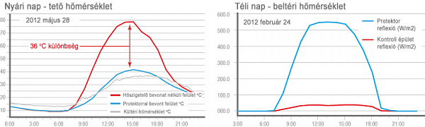 A lenti grafikonokból (a tanulmányból) látható, hogy a Protektor szigetelőbevonat hozzájárult a beltér hűvösebben tartásához a meleg nyári hónapokban, míg a hideg téli hónapok során segített a fűtőrendszer által előállított meleg megtartásában.