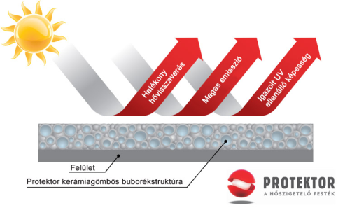 A Protektor hőszigetelő bevonat* sikere abban rejlik, hogy képes a hőhullámok nagy részét visszaverni, azaz képes a „sugárzó hőt blokkolni” hőfékező tulajdonsága által. A Protektor hőszigetelő bevonat több millió üreges kerámiagömbből áll, amely speciális buborékszerkezetet alkot, így sikeresen hozzájárulhat:
