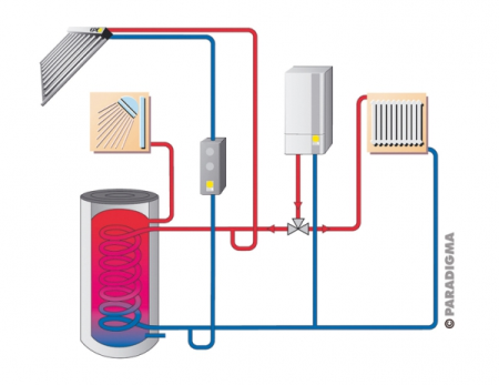 - A Paradigma AquaSolar rendszereknél a napkollektorok hidraulikai elválasztás nélkül, pontosan úgy töltik a tárolót, mint egy második kazán. Ez a bekötési mód lehetővé teszi a napkollektorok fűtésrásegítésre való egyszerű alkalmazását is Tuning set beépítésével, második, fűtési puffertároló alkalmazása nélkül.