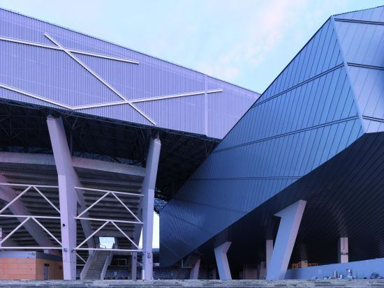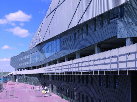 A homlokzaton összesen mintegy 48 tonna patinás Rheinzink lemezt használtak fel. A ferde sávok és korckiosztás révén sikerült elérni, hogy az épület méretei vizuálisan csökkennek, a nagy felületek nem váltak unalmassá, és szépen hangsúlyozzák egy labdarúgó aréna dinamizmusát.