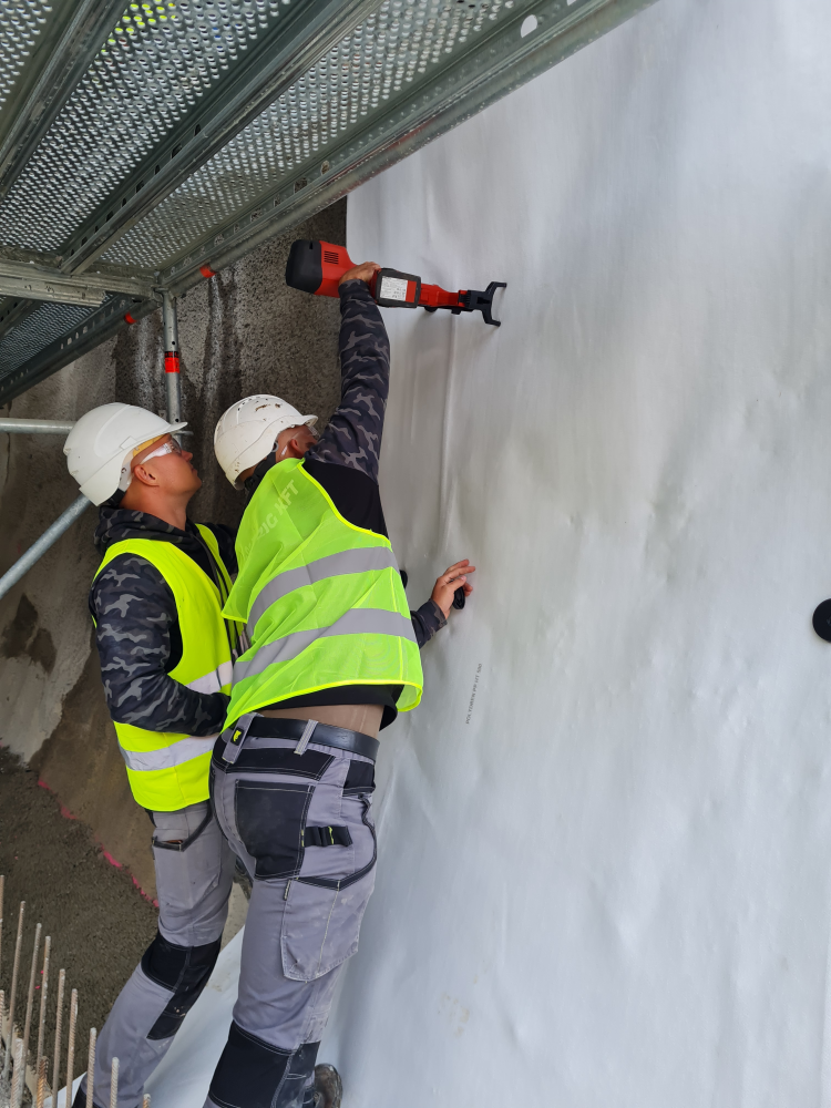 Az állványzat felállítása és behúzása után kezdhették meg a szigetelés kivitelezését. Egy állásban egyszerre 6 méter széles felületet tudtak munkába venni, amin 6-7 ember dolgozott egyszerre. Első lépésben a megkapott alapfelületre 500 g/m2 tömegű geotextíliát fektettek, amelyet tárcsás PVC rondellával, Hilti szöggel lőttek fel. A tárcsás rondellákhoz forrólevegős hőlégfúvóval sütötték hozzá a 2 mm vastag Mapei PVC vízszigetelő lemezt, amely így a tárcsákra függesztve lógott. A második alagútban gyorsítottak a kivitelezés ütemén, ugyanis ott már két ugyanolyan állványzatról, két egymást követő csapat végezte a szigetelés kialakítását. Az első állványról a geotextilt rögzítették, míg a PVC lemezt a második állványon dolgozók helyezték el.