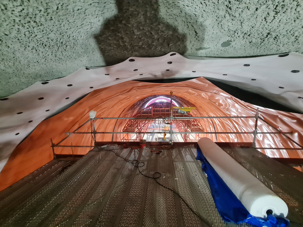 A járatok boltozatának felszíne a bányászat után nem volt egyenletes, ezért erre egy megközelítőleg 30-35 cm vastagságú lőttbeton réteget kellett felvinni, ami az egyenetlenségek java részét felvette. Az erre a célra megfelelő betonminőséget, illetve technológiát a tervezés után a helyszíni adottságokhoz igazítva véglegesítették. Az így kialakult réteg nagy része már csak minimálisan volt egyenetlen; azon a néhány helyen, ahol szükséges volt, kosaras kocsiból még javították, simították a felületet. Így alakult ki az a felület, ami már kellően sima, illetve éles, hegyes kitüremkedésektől mentes volt, így egyúttal alkalmas a vízszigetelés fogadására is.