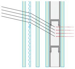 Mind az elvi működés, mind a felhasznált építőanyag (égéskésleltetővel kezelt, újrahasznosított papír hullámkarton) szempontjából az előzőtől eltérő megoldás az úgynevezett részben fényáteresztő transzparens hőszigetelésű, felületi rés-struktúrák alkalmazása. Ezek működése azon az elven alapul, hogy a beeső napsugárzás jelentős része e TH anyag külső 1-1,5 cm vastag rétegében nyelődik el, felmelegítve azt, ezáltal egyfajta „hőfüggöny" képződik a hőszigetelés külső felületén, amely lényegesen csökkenti a belülről kifelé irányuló hőáramokat (6a ábra), ezért elsősorban a hagyományos opaque hőszigetelések hatékonyságának fokozására, üvegezett homlokzati panelekben, előtét-hőszigetelésként alkalmazzák (6b ábra).