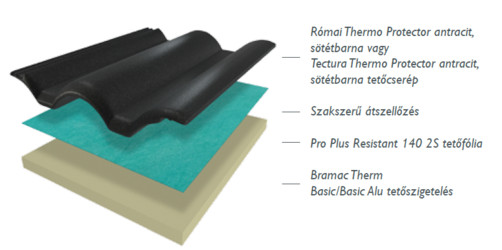 A °Cool Prémium rendszer a Római Thermo Protector antracit, sötétbarna vagy Tectura Thermo Protector antracit, sötétbarna tetőcserép, a szakszerű átszellőzés, a Pro Plus Resistant 140 2S tetőfólia elemek mellett Bramac Therm tetőszigetelést is tartalmaz. A PIR hab a szarufa külső síkjára kerül, és vékonyabb, mint más hőszigetelő anyagok, így növelhető a tető alatti tér. A Bramac Therm Basic szarufa feletti PIR tetőszigetelés felújításhoz, míg a Basic Alu szarufa feletti PIR tetőszigetelés új építéshez ajánlott. Ezzel a csomaggal már több mint 11 °C-os hőmérséklet különbség érhető el, a nap folyamán pedig minimálisra szorítható a hőingadozás (2 °C), és még a csúcshőmérséklet is 7 órával kitolódik.
