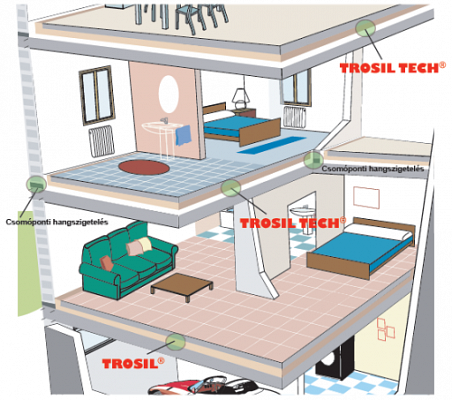 A lépéshang-szigetelő képesség és a dinamikai merevség kedvező értékeivel a termék a legalkalmasabb hangszigetelő anyagok egyike, mivel minél alacsonyabb egy anyag dinamikai merevségének értéke, annál jobb hangszigetelő tulajdonsággal rendelkezik. A Trosil Tech hőszigetelő képessége is jó (hővezetési tényezője 0,0344 W/mK), így az akusztikai szigetelés mellett egyben az úsztatott aljzatok hőkomfort-érzetét is növeli.