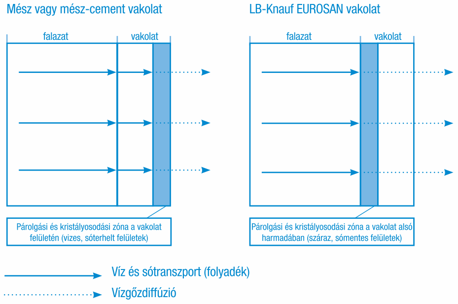 Először fussuk át röviden az Eurosan felújító vakolatrendszer működési elvét, mechanizmusát. A hagyományos mész-, mész-cement, esetleg erős cementvakolatokkal ellentétben az Eurosan rendszer nem zárja le a nedvesség távozásának útját a felületen, nem károsodik sók és víz behatolása következtében, és a felületén nem jelenik meg algás, gombás foltosodás. Ezzel szemben a szabad pórusain keresztül utat enged a falszerkezetben felgyülemlett nedvességnek, miközben az általa szállított sókat a szerkezetén belül elraktározza. Minden olyan esetben célszerű a használata, amikor nedvesedés tapasztalható a szerkezetben, még akkor is, ha más vízszigetelési eljárásokat (például injektálást) is alkalmaznak, hiszen az átnedvesedett falak kiszáradása akár évekig is eltarthat.