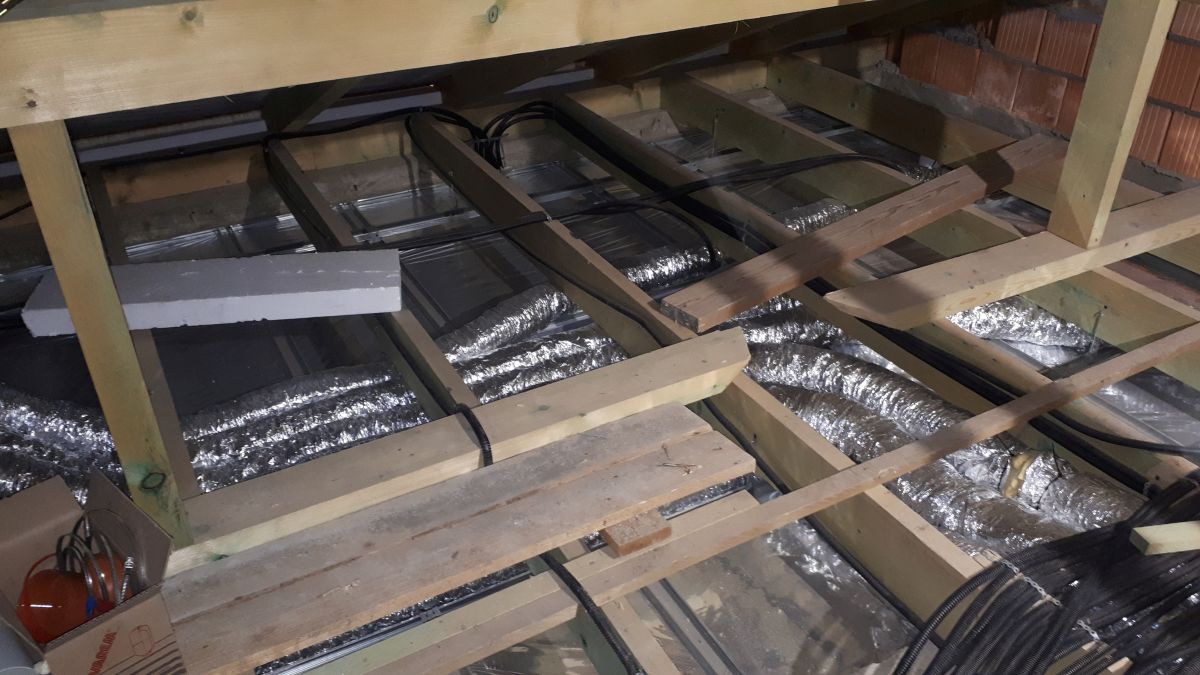 Ez esetben a födémszerkezet felső síkjára 60-80 cm közökkel teherhordó vázszerkezetet kell készíteni Ursa extrudált polisztirolból vágott 10 cm széles „hasábokból” és ezeket nem-térfogatnövekedő ragasztóhabbal rögzíteni. Ezekre 10 cm széles, min. 2,5 cm vastag lécek kerülnek, ugyancsak ragasztva. Ez az „Ursa XPS bakos szendvics-szerkezet” adja meg a hőszigetelés vastagságát, ez oldja meg a vonalmenti teherátadást, és ez fogadja majd a szegezett vagy csavarozott járható deszkaborítást is. Párafékező és légzáró Ursa Seco Pro 2 fóliát kell végig leteríteni az XPS-bakokon is átvezetve, az átlapolásokat egymáshoz légtömören leragasztva Ursa Seco Pro KP ragasztószalaggal. Az így kialakított, fóliázott „hőszigetelő-tartó” közökbe kell méretre szabni és elhelyezni az Ursa szálas ásványgyapot szigetelőanyagot minimum 20 cm vastagságban: ajánlott az Ursa SF 32, Ursa SF 34, Ursa DF 37 Optimum, Ursa DF 39, az 37 illetve az Ursa Tectonic APh Acoustic vagy az Ursa Terra 74 Ph és Ursa Terra 78 termékek bármelyike. Javasolt a ritkított deszkaburkolat alá leteríteni egy réteg geotextíliát, amely megvédi a gyapotot a téli áramló hideg levegőtől és a por elleni védelem szerepét is betölti.