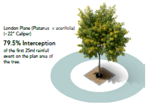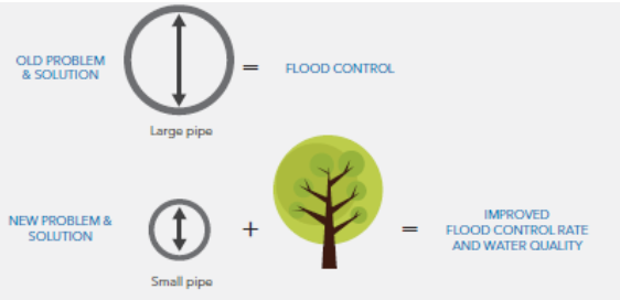 A hektikusabbá váló időjárásnak és a „felsűrűsödő” városközpontoknak köszönhetően a csapadék egyre gyakrabban és több városban okoz problémát. A városi növényzet bevonása a vízgazdálkodásba 20-25 százalékkal csökkentheti az elárasztásokat, és jelentős mértékben az öntözési és egyéb költségeket is, ugyanakkor kevésbé beruházás igényes, mint a csatornarendszer bővítése.